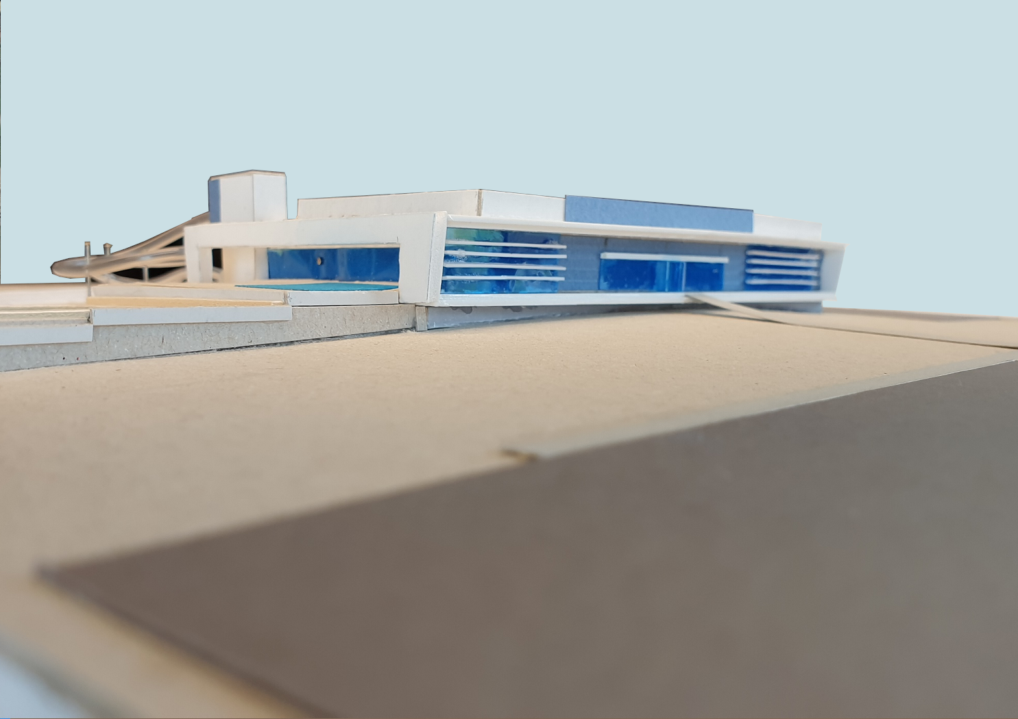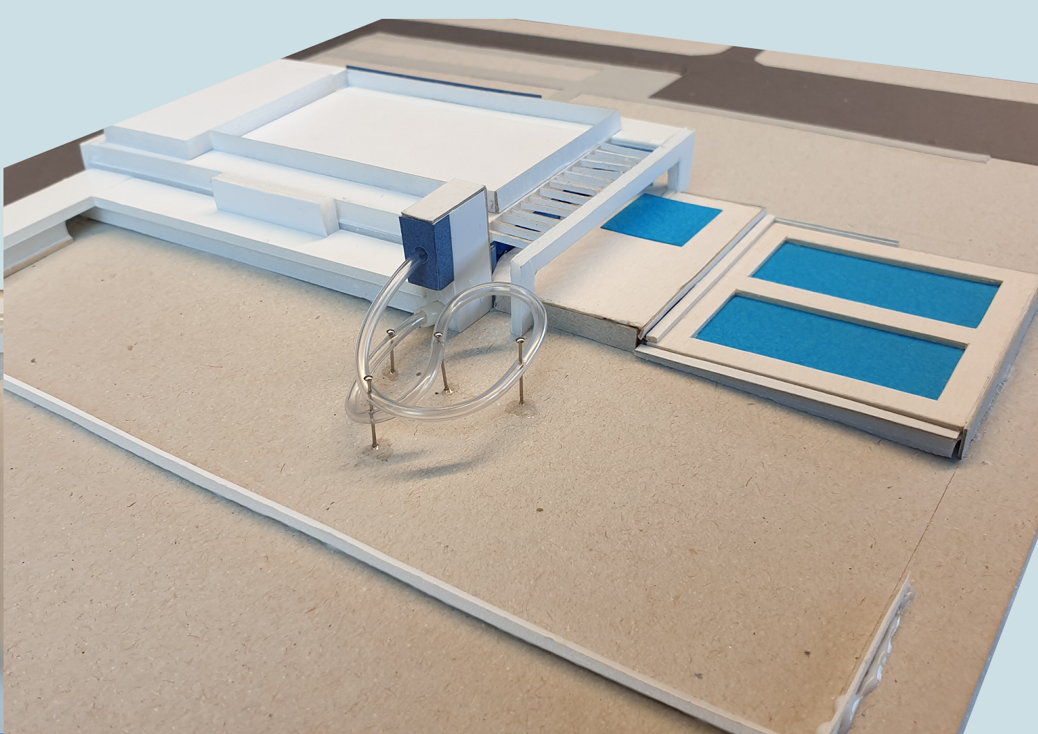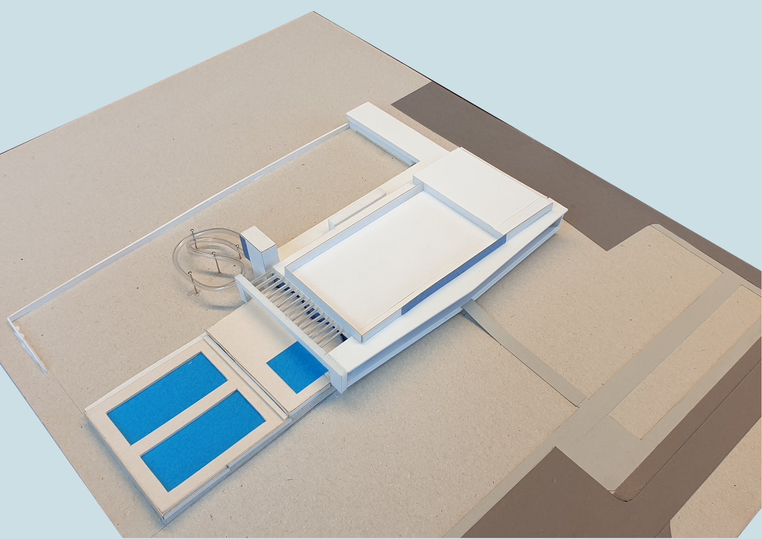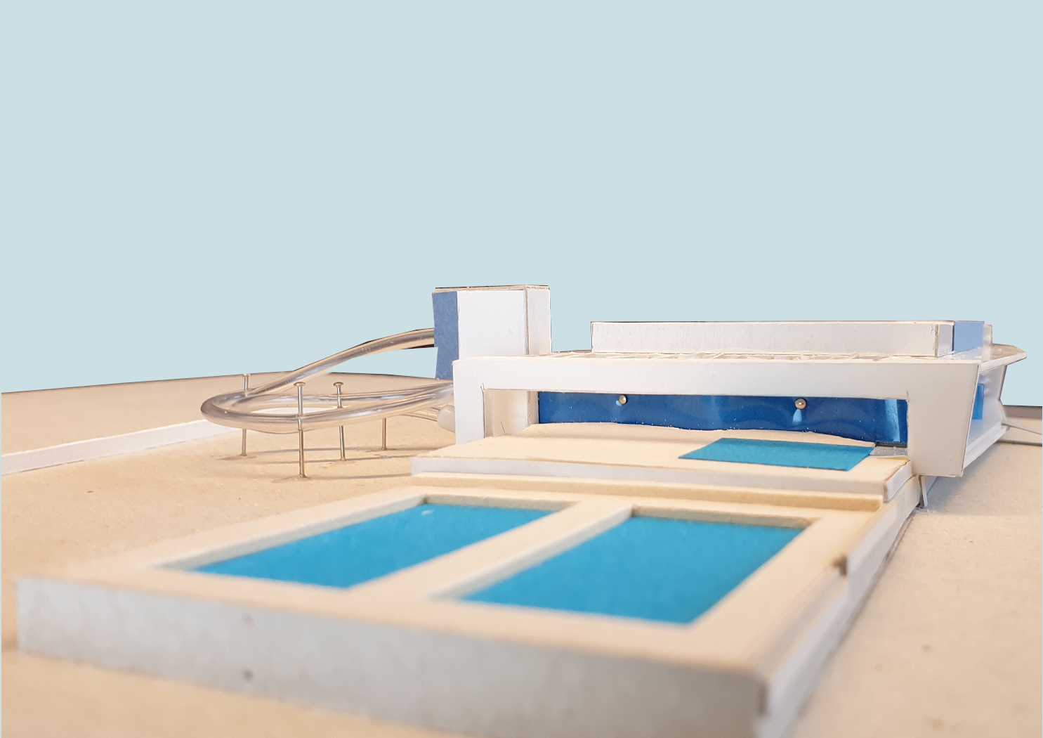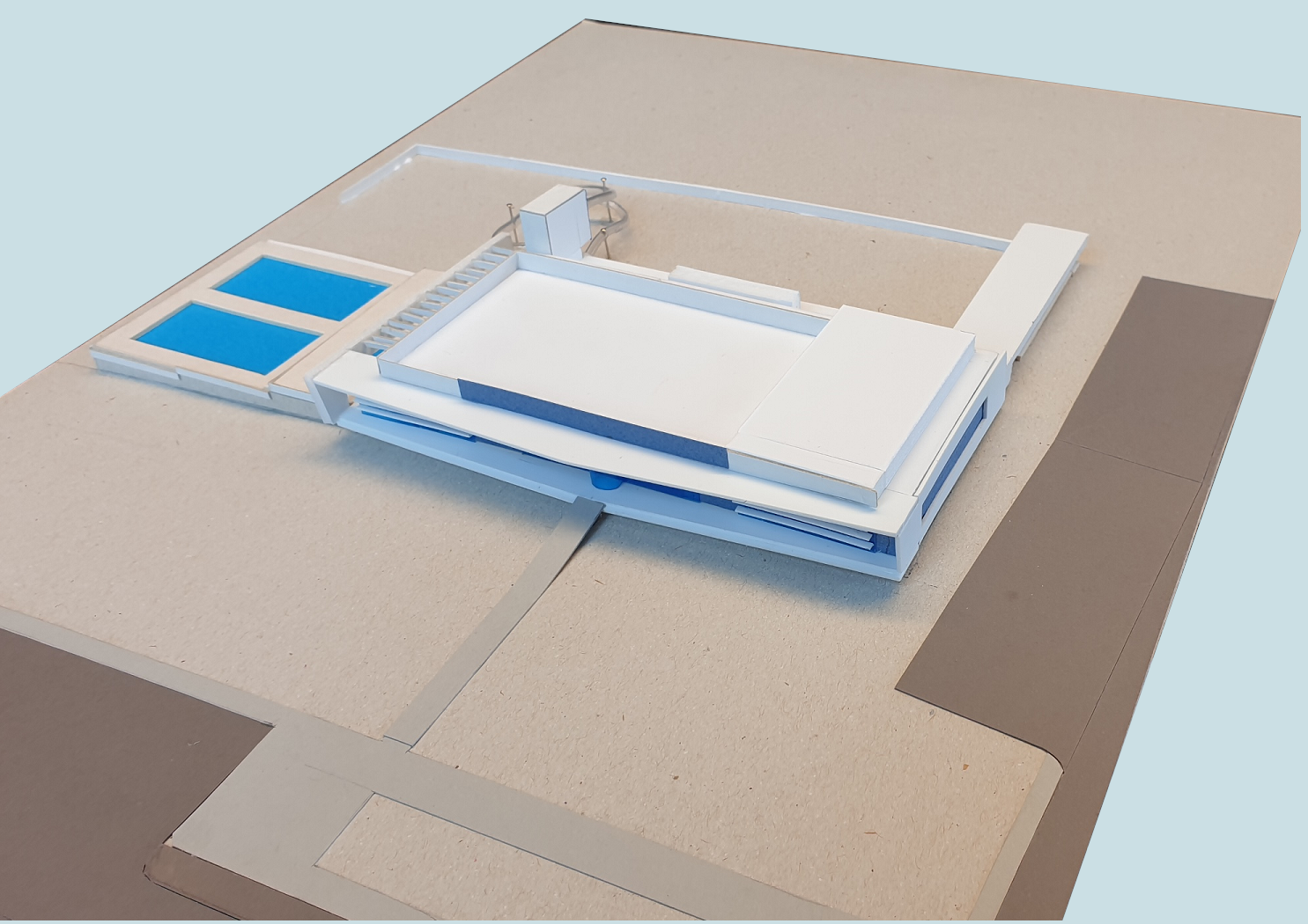 Koncepcja konkursowa basenu w Piasecznie. W budynku przewidziano część sportową z basenem pływackim dł. 25m, część rekreacyjną, oraz wypoczynkową. Przewidziano także baseny zewnętrzne.