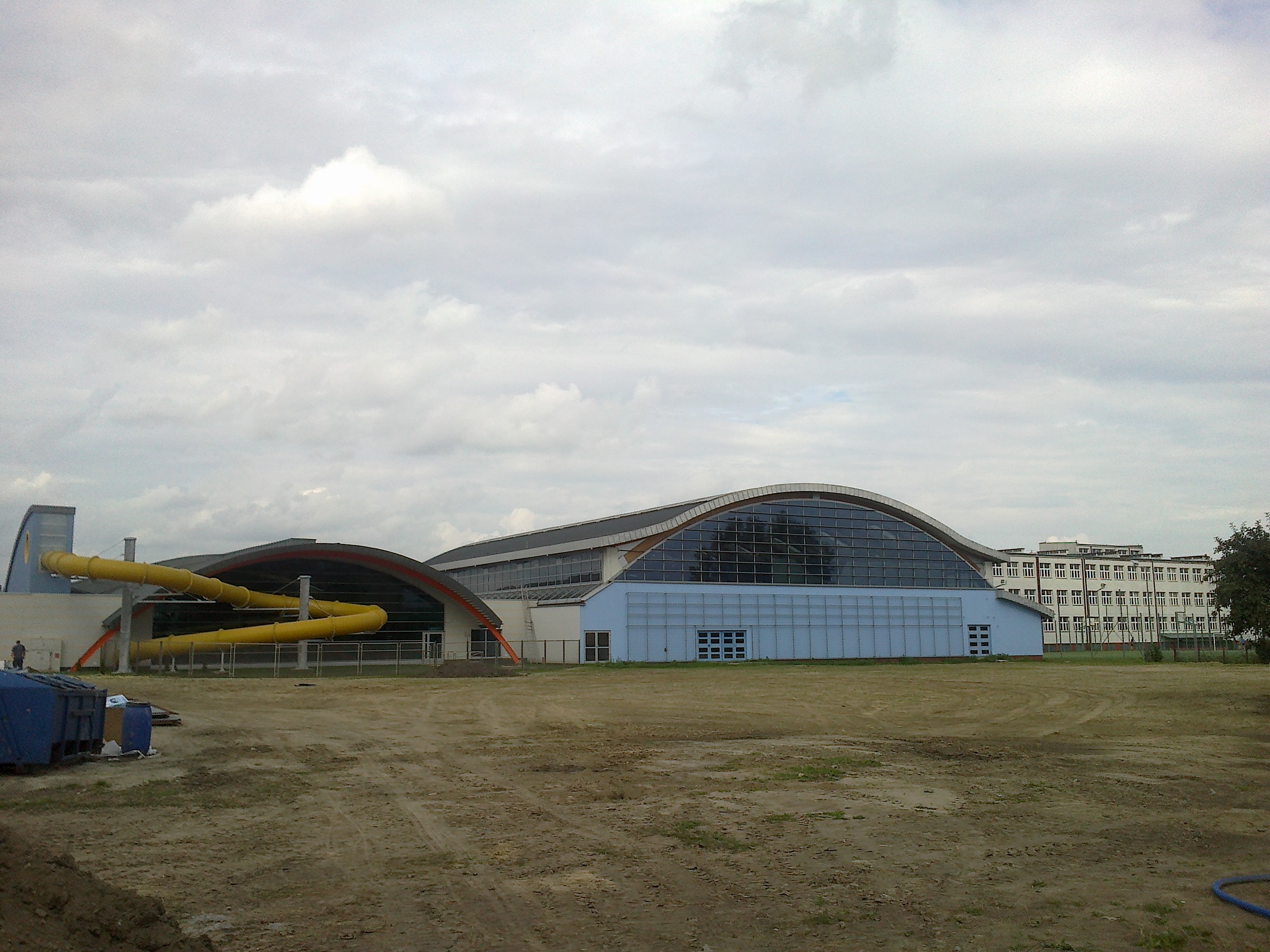Projekt zrealizowany. Na kompleks sportowy składa się blok pływalni z basenem sportowym, zespołem rekreacyjnym i saunowym, a także hala widowiskowo-sportowa z boiskiem wielofunkcyjnym.
